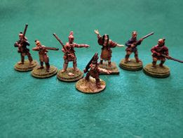 My wife, Beth's Lenni Lenape force (She has First Nation's heritage) (I was given their names in the Lenape language.) L to R: 2 rifle-armed warriors (Xinkwëlëpay and Sek'téh), the Sachem commanding (Chitkunk'tek), the Shaman (Occultist named Mpaola),the Wise Woman (doctor named Nushénakw), 2 more rifle-armed warriors (Tahkoxi and Pamputis) {In English - Big Deer, Black Heart, Quiet Heart, Spirit Man, Mother Tree-willow, Little Turtle, and Snapping Turtle} |
