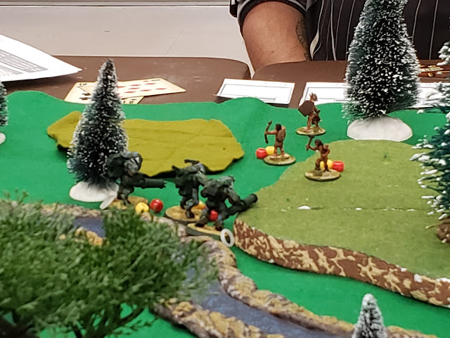 In the first game, both "human" players (Aris and Ryan) had teams of 5 First Nations warriors, armed with bow and arrow or spear. Some of the names I put together for their crews were "Hands-to-the Sky", "Head-of-Rock", "Fleet-of-Foot", "Joe Bear-killer", and the ever-popular "Dances-with-Vermin." Bear, the third player had three Alien Hunters in Holo-suits that made them almost invisible (unless you crossed a body of water which shorted out the suit for a turn), carrying lasers, and being big and nasty. The humans started at opposite corners of the field and the Aliens started dead center on the table. I'll try not to reveal too much about the scenario in case someone reading this wanted to surprise their players with it. It really was a lot of fun.