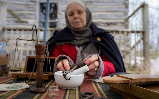 With balance, pill roller, mortar and pestle, tooth key, wooden stethoscope, and a jar of "maggots", my wonderful wife educates the visitors about being an apothecary. ('Maggots' courtesy of Canadian Tire's fishing equipment selection.) |